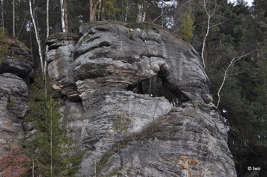 Najednou jsem u silnice (+ 20 minut), a otevírá se pohled na skalní masiv přes čerstvě pokácený porost. Pozornost tak jednoznačně upoutá zvláštní útvar na konci masivu, skalní okna Kolonáda. Kvůli nim jsem málem přehlédl ve stínu se krčící jeskyni Starých časů, ze všeho nejvíc připomínající do pískovce vytesaný posed.