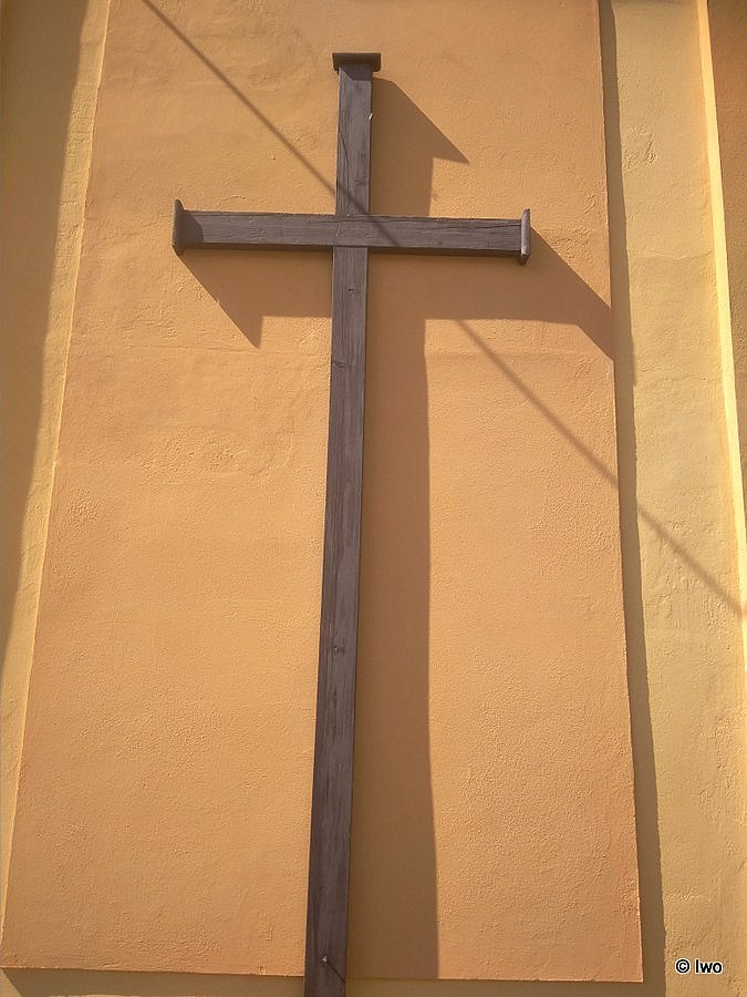 Na zadní straně kostela prostý dřevěný kříž. Pokud mám vycházet z dosavadních zkušeností, bývají takto zvnějšku upevňovány kříže tzv. misijní. O tomto konkrétním však v žádném dostupném popisu kostela ani slovo. Kříž byl na svém míst dle dostupných zdrojů již před rekonstrukcí kostela: