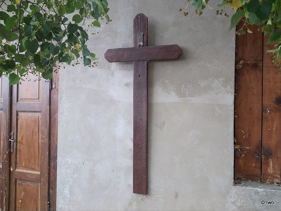 Předpokládám, že domek je bývalou márnicí, a že jednoduchý ke zdi přišroubovaný kříž nahrazuje na ploše hřbitova nepřítomný kříž centrální.