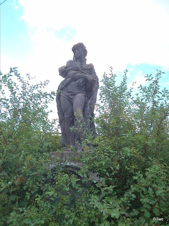 1967: Pískovcová socha Krista cca životní velikosti má náznak kontrapostu, jemně pročleněnou hlavu s trnovou korunou sklání k pravému rameni, ruce jsou svázány před tělem, levá noha chybí, je pohozena vedle za čekárnou autobusu. Kristus je oblečen v bederní roušku a plášť, sepnutý na prsou a splývající po stranách boků až k nohám. Socha nese zbytky nabílení. Velmi kvalitní ukázka barokního sochařství před 6-7 lety rozbita, hrozí úplná zkáza.