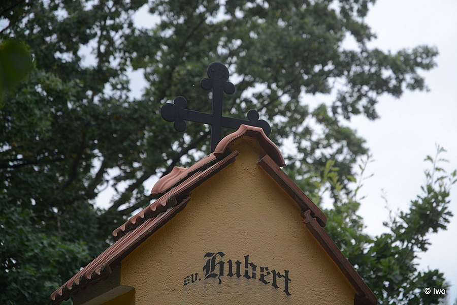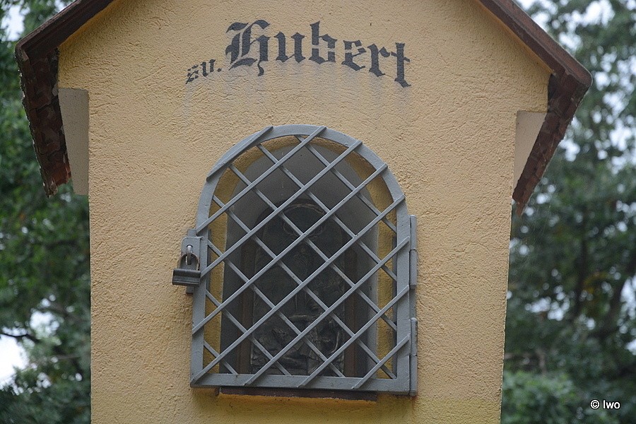 Nízká čtvercová základna nese sloup, na jehož vrcholu sedí velká kaplice se zamřížovaným výklenkem a stříškou krytou bobrovkami. Tabulka u cesty podává info o vzniku: Boží muka postavena 1. 5. 2010 / na počest patrona myslivců sv. Huberta / na vlastní náklady místními občany / stavit. Miroslavem Vítem / a zdejším lesmistrem Miroslavem Pelichovským, / k obohacení malebnosti / Českého venkova a Podřipského regionu.
