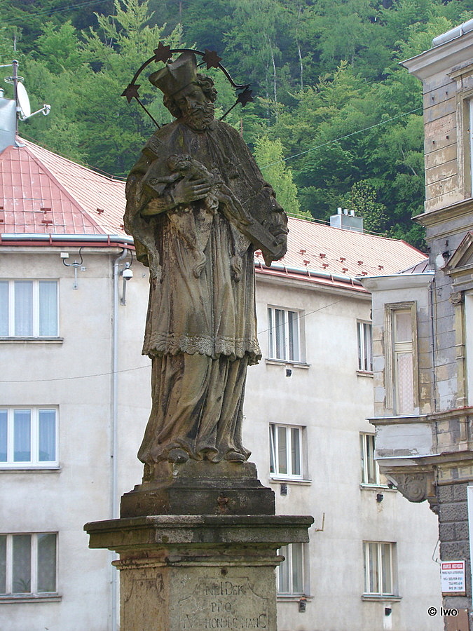 Před kostelem svatého Martina v Nejdku dělá společnost dvěma sloupům socha svatého Jana Nepomuckého.