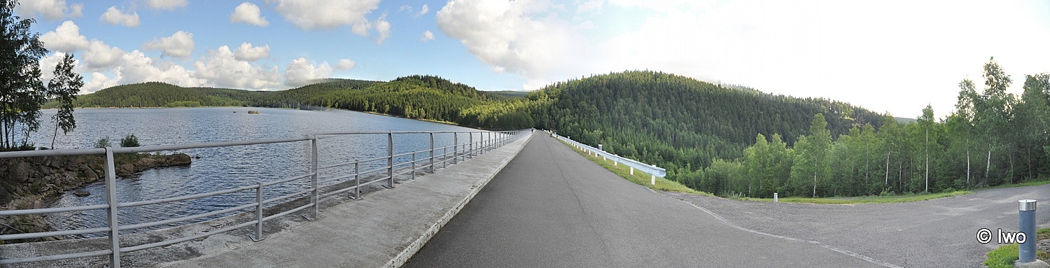 Auto jsem nechal v Hraběticích na parkovišti u kapličky (stokoruna za celý den) a po asfaltce se vydal k přehradě. Krátká procházka lesem a najednou se mezi stromy objevuje lesknoucí se vodní plocha s nepřehlédnutelnou dominantou – na konci mostku stavba, ukrývající strojovnu, malou vodní elektrárnu a odběr vody směrem na Bedřichov (2,5 km dlouhou štolou v hloubce až 130 m), kde je úpravna. Nad hladinou tři patra, dolů snad deset, pokud se pamatuji dobře. Most ke stavbě je ocelový a má délku 150 metrů. Hloubka je tady kolem 38 metrů.