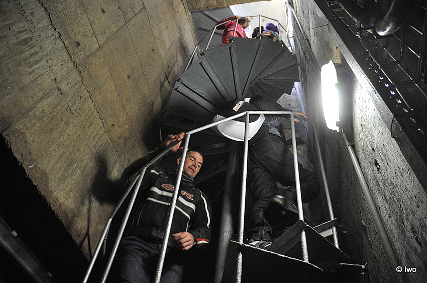 To nejatraktivnější přišlo po výkladu na povrchu – vstupujeme do betonové věžičky, připomínající bunkr, a po schodech klesáme pod zem. Nic pro klaustrofobiky, betonovou šachtou sestupujeme pode dnem přehrady k měřicím přístrojům a přepadům, od vodní masy nás nad hlavou dělí metr a půl armovaného betonu. Docela atletický výkon, projít celou trasu a vystoupat na druhé straně přehrady na světlo – hrázný tu trasu absolvuje dvakrát denně.