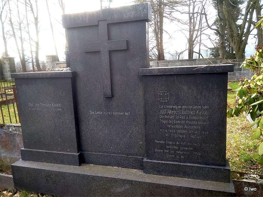 V horní pustší části hřbitova v Mikulášovicích vlevo od vstupu se nachází hrobové místo, plánované zřejmě jako rodinný hrob, na němž jsou však jen dvě jména – jedním záznamem je kenotaf Albrechta Gottfrieda Keidela.