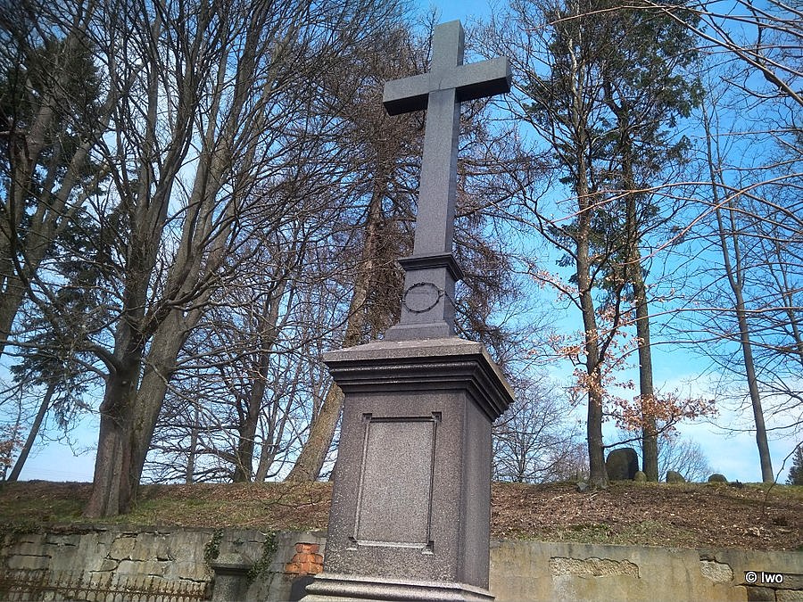 Pod zídkou, podpírající zmíněnou plošinu, podstatně převyšující terén spodní části hřbitova, je v obrubníkem oddělené travnaté části několik schodových stupňů, na nichž stojí nižší kamenný sokl čtvercového půdorysu s násobnou profilovanou lištou v horní části. Na ní sedí vysoký o něco užší sokl. V čelní straně obdélné vybrání s malými uchy a tenkým rámem, zřejmě pro dnes chybějící nápis či reliéf. Boční stěny hladké, vzadu nápis: