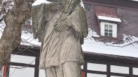 Barokní pískovcová plastika světce v životní velikosti, oděného v tradičním rouchu s biretem na hlavě, krucifixem v levé ruce a pravou rukou na prsou, pochází z roku 1768 a je umístěna na hranolovém soklu s patkou a římsovou hlavicí.