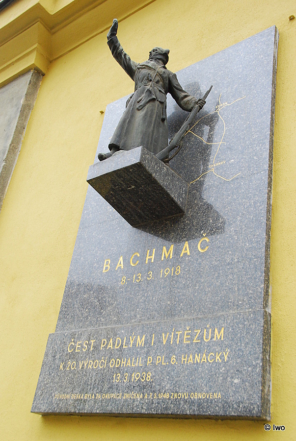 Nejrůznějších památníků, pomníků a pamětních desek najdeme ve více než stotisícové hanáckě metropoli, celkem pochopitelně, dost a dost. Většinu z nich míjí obyvatelé města i jeho návštěvníci takřka bez povšimnutí, pár jich však zaujmout dokáže. Mnohdy už jen tím, že nějak vystupují před hmotu budovy, na které jsou umístěny. A právě mezi takové patří i pamětní deska připomínající bitvu u Bachmače, která proběhla ve dnech 8. až 13. března 1918 a která měla k Olomouci blíže než si mnozí uvědomují.