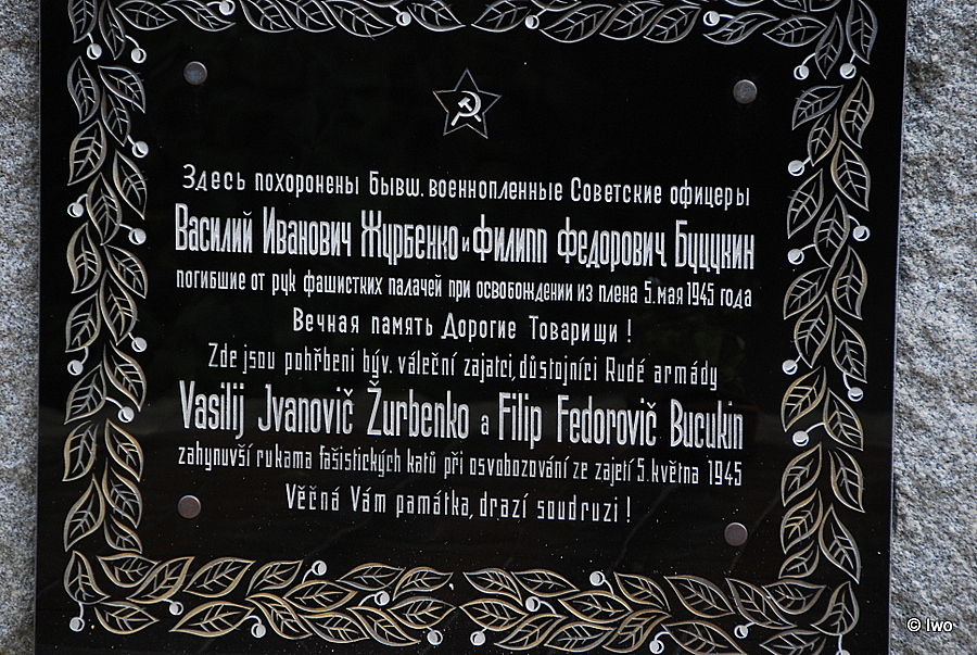 Památníku vévodí komolý jehlan sestavený ze žulových kostek. V dolní časti tohoto tělesa je připevněna černá deska s textem: Zde jsou pohřbeni bývalí váleční zajatci, důstojníci Rudé armády Vasilij Ivanovič Žurbenko a Filip Fedorovič Bucukin zahynuvší rukama fašistických katů při osvobozování ze zajetí 5. května 1945. Věčná Vám památka, drazí soudruzi.