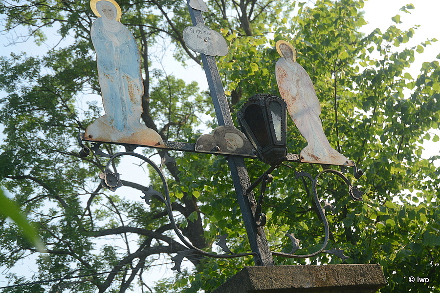Na široké nahoře ploché hlavici je umístěn siluetový kříž, zřejmě v relativně nedávné době opravovaný. Ve spodní části jednoduché rozviliny s květinovým dekorem, uprostřed na těle břevna menší kovová lucerna. Na příčném břevnu vlevo (?) Panna Maria se zkříženýma rukama, vpravo (?) vpravo svatý Jan Evangelista s rukama sepjatýma. Mezi nimi lebka (viz wiki – Hora Kalvárie je místo, kde byl podle Bible ukřižován Ježíš Kristus, Původní označení Gûlgaltâ v aramejštině a podobné v hebrejštině znamená lebka. Podle některých křesťanských a židovských tradic bylo u paty kříže místo uložení lebky Adama – prvního člověka, jehož prvotní hřích byl odčiněn tím, že na jeho lebku skanula Kristova krev při ukřižování, a tím byl s Kristovou obětí vykoupen i hřích Adamův.).
