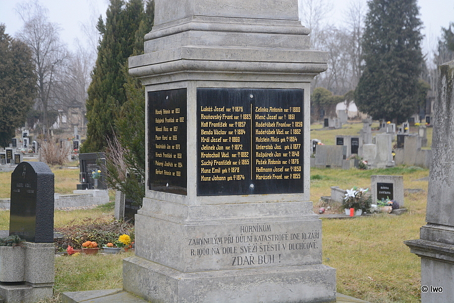 Takřka ve středu hřbitova v Duchcově je umístěn památník obětí neštěstí na dole Svěží štěstí.