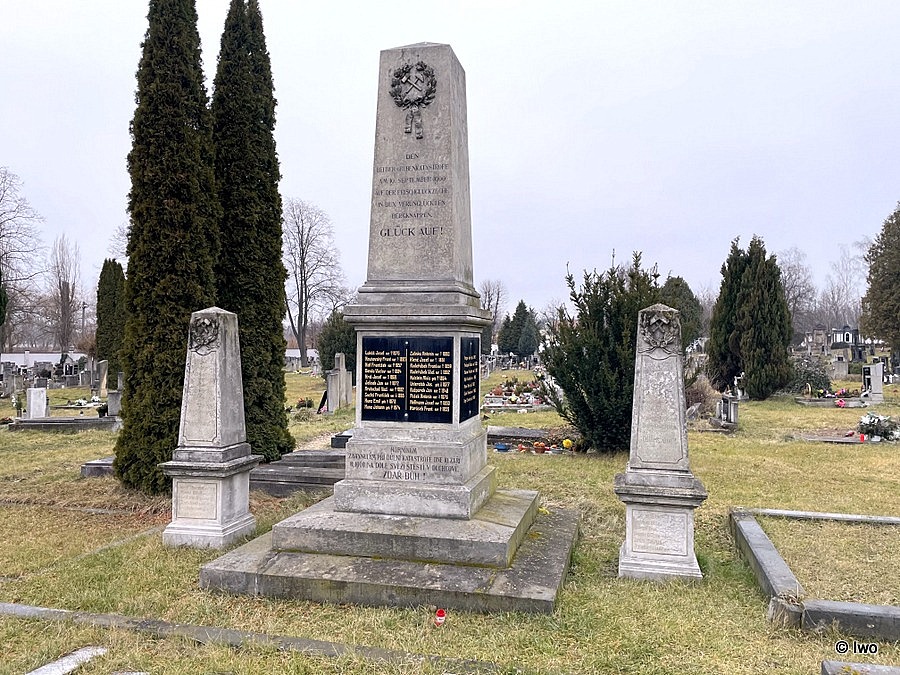 Památník horníků, kteří zahynuli při důlní katastrofě dne 10. 9. 1900. Čtverhranný obelisk osazený na třístupňové podnoži, v horní části vavřínový věnec se stuhou s hornickými kladívky uvnitř. Horní německý a dolní český nápis je věnován obětem.