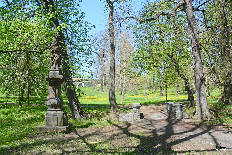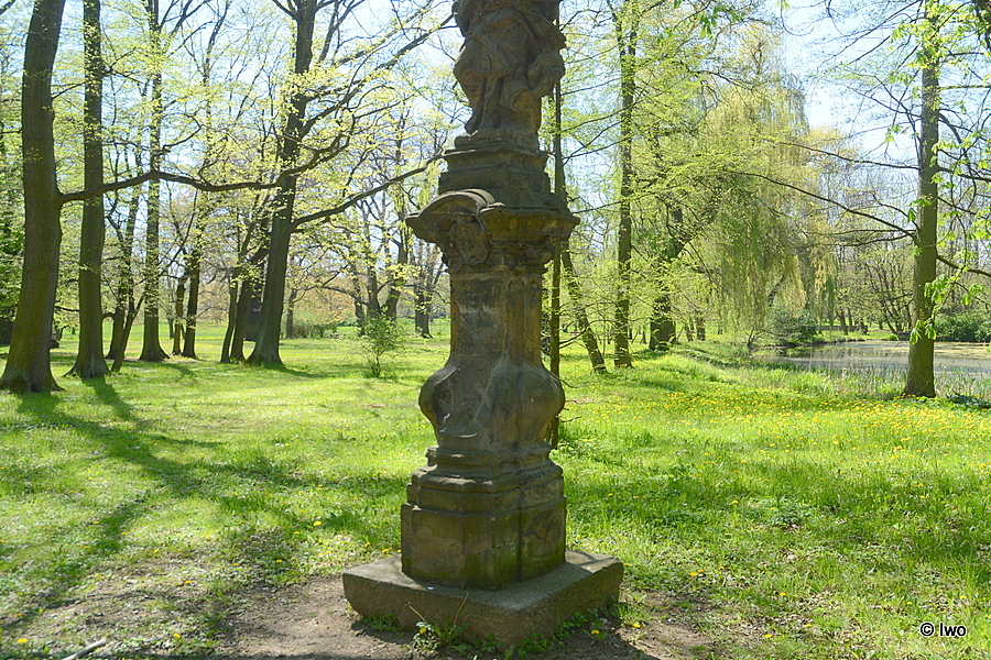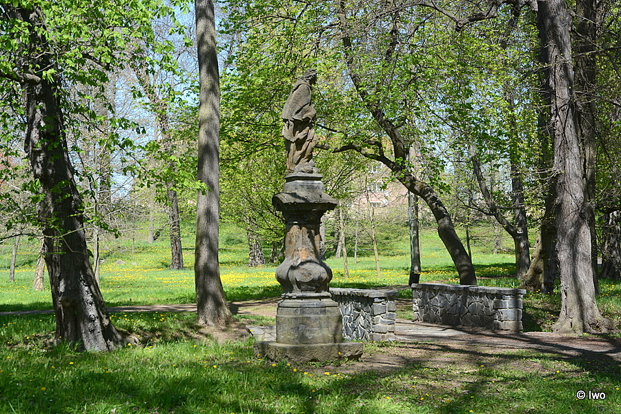 U mostku přes koryto, spojující bezejmenný rybníček v parku u zámku v Duchcově s rybníkem Sfingovým, stojí socha svatého Jana Nepomuckého.