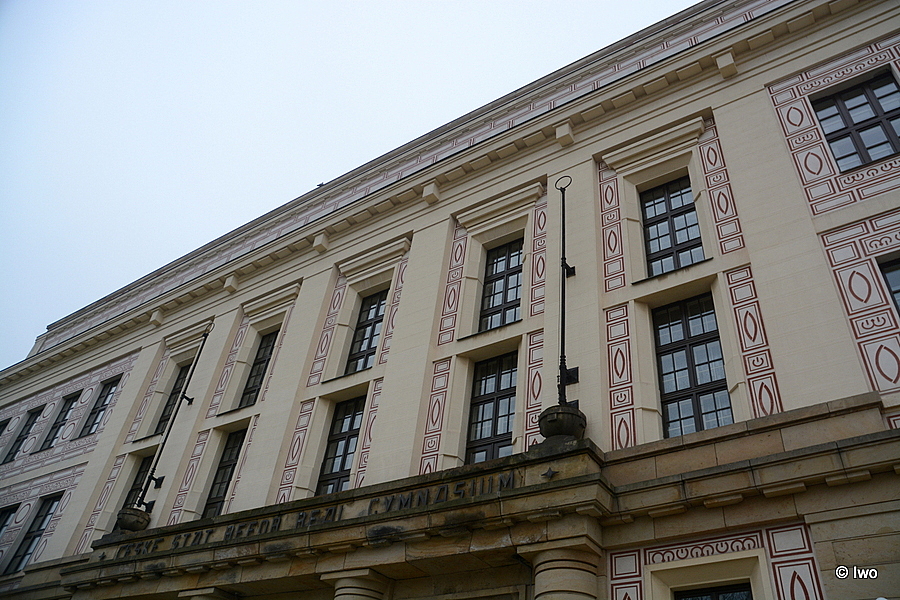 Čtyřkřídlá dvoupatrová budova bývalého českého gymnasia kolem čtvercového dvora, zděná a omítaná. Průčelí s 13 okenními osami. Střed s 5 osami rozčleněn úzkými lisenovými rámy, postranní osy uzavřeny v 1 rám. Patra oddělena pásovými římsami, pod hlavní římsou zubořez. V přízemí 3 vchody oddělené bosovanými polosloupy. Stěny pokryty červenobílým sgrafitem obloučkového dekorativismu. 1921 – architekt L. Skřivánek.