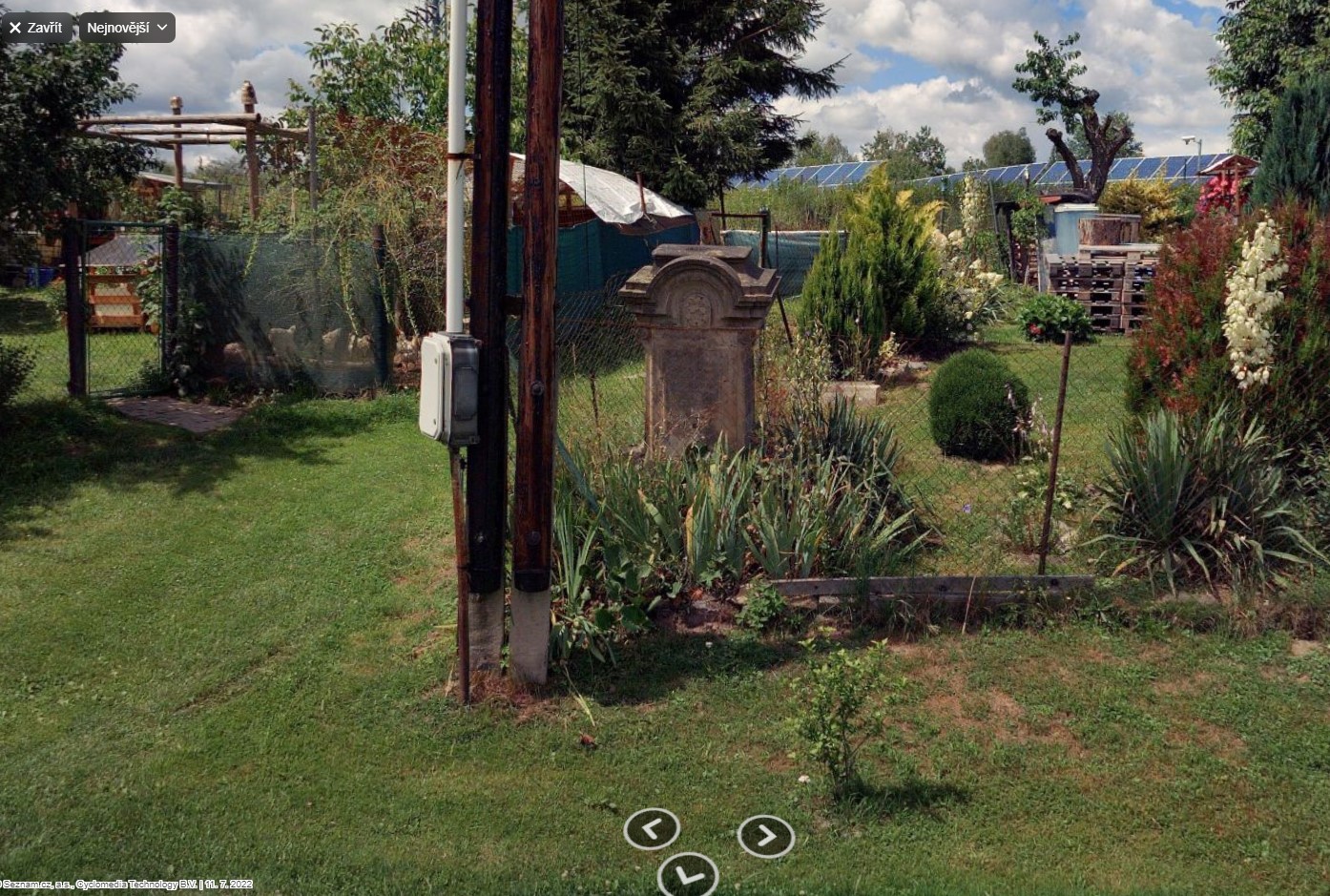 Na rohu v zahrádce za drátěným plotem v zákrytu za dřevěným dvojsloupem se nachází zachovalý, leč silně nahnutý sokl bez kříže.