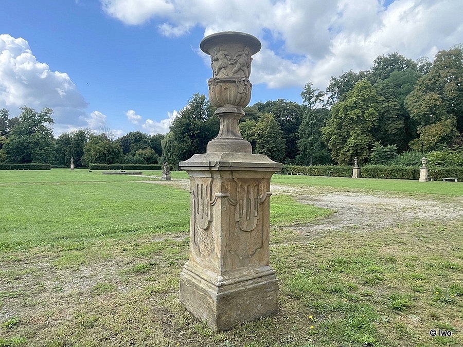 Vázy blíž k zámku jsou zdobeny reliéfem tančících putti, vzájemně propojených drapérií, které se všichni drží. Pod nohama putti čtyři chrliče.