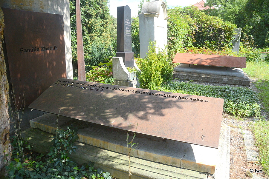 Na hřbitově v Liběchově se v poslední řadě náhrobků před sníženým oddílem nachází pietní místo – památník rodu Veithových.