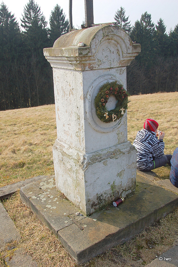 Ze starých časů tu dodnes zbyl jen vysoký kříž. Také má již leccos za sebou; zatímco teď jeho pískovcový sokl zdobí litinový krucifix, v 19. století měl kříž ještě plechové malované siluety Krista, Panny Marie a učedníka Jana. Musel tedy přečkat po třikráte zlom století. Podle vzpomínek posledního z rodu Hessů ale dokonce ani onen kříž se siluetami nebyl nejstarší, údajně měla na tomto místě stát předtím sloupková kamenná muka. Možná … snad. Místo je opravdu pro boží muka jako stvořené. Nápis na soklu už smyly větry a deště, ale v 19. století zde bylo psáno: „Mensch! Schau‘ diesen Krucifix hin an / Denk ‚ nach, was er für dich gethan / Er hat sein heisses Blut und Leben / für uns dargegeben. / O Mensch, für dich bin ich gestorben / Und hab‘ für deine Sünd‘ das Heil am Kreuz verdorben.
