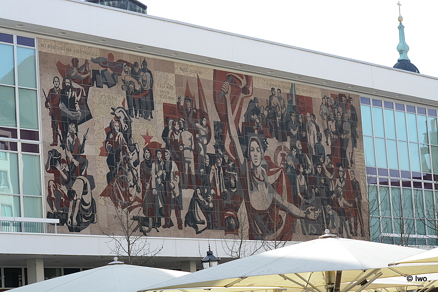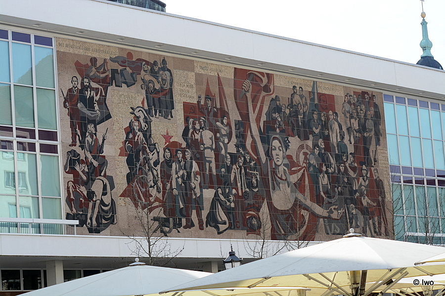 Angažované dílo minulého režimu, které překvapuje. Kupodivu alespoň tentokrát se něco málo dá najít i v češtině: V průčelí Paláce kultury se nachází nápadná mozaika s názvem Cesta rudé vlajky (německy Der Weg der roten Fahne) od Gerharda Bondzina. Byla dílem více autorů a byla dokončena v roce 1968.