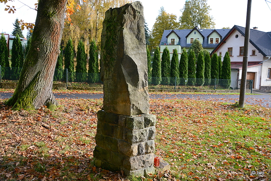Pískovcový obelisk bez nápisových desek. Vlastník zamýšlí obnovu nápisových desek dle historických fotografií.