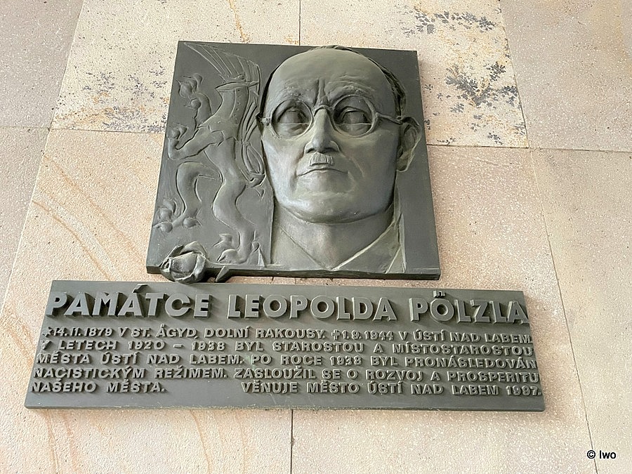 V průchodu do atria komplexu budov bývalého Krajského národního výboru v Ústí nad Labem z ulice Velká Hradební je umístěna pamětní deska Leopolda Pölzla.
