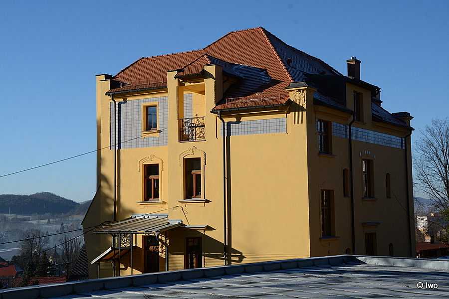 Secesní dvoupatrová vila se členitou střechou pochází z roku 1908. Z průčelí vystupují rizality kryté valbovými stříškami stejně jako ústřední prostor vily. Rizalit jižního průčelí je zakončený segmentovou atikou s ozdobným květinovým dekorem.