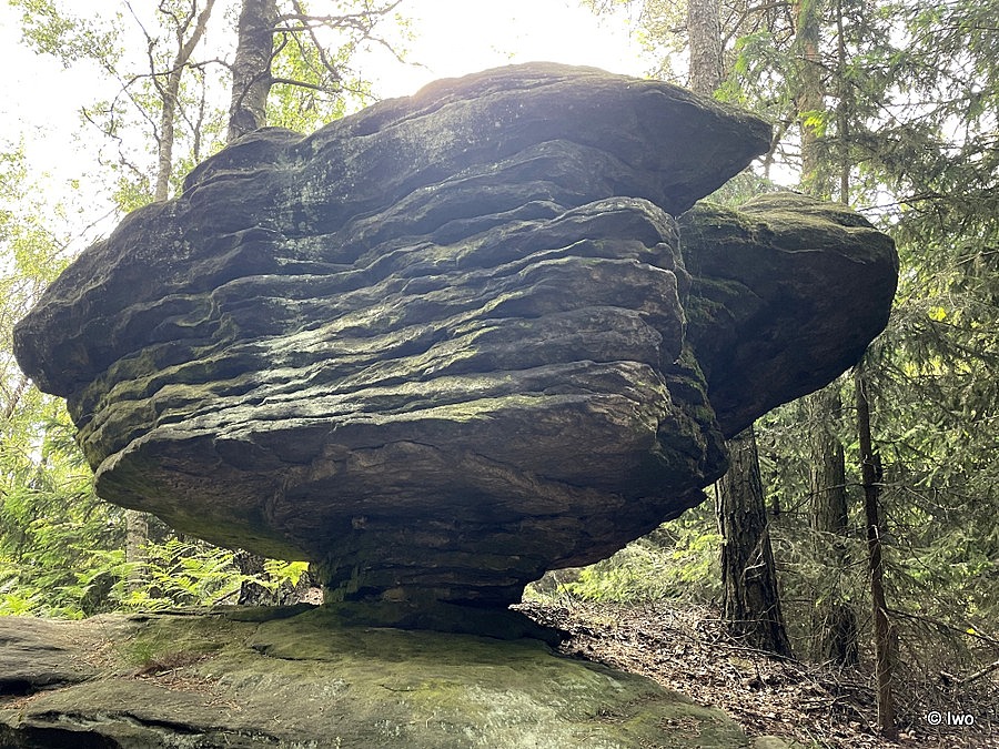 Tenhle kámen, pokud nemáte oči na stopkách, nejspíš při putování touhle oblastí přehlédnete, protože budete mít oči stočené na opačnou stranu, k výhledům do kraje. Ono i to, co je z cesty vidět, není úplně nápovědné – sice tvar zaujme, ale překvapení čeká až zblízka. Horní balvan spočívá na podkladu na opravdu minimální ploše. Ovšem zkoušet, zda jde opravdu o viklan, to se mi vskutku nechtělo. Protože myslím, že až se ta masa jednou dá do pohybu, pak už se nebude nač dívat…