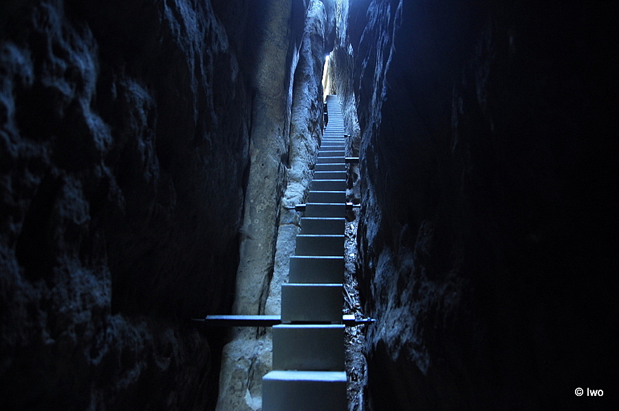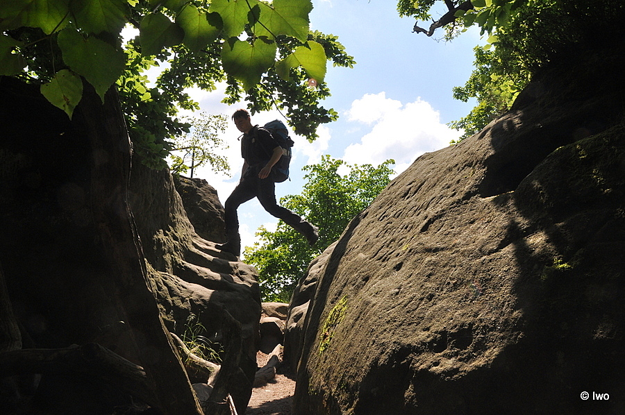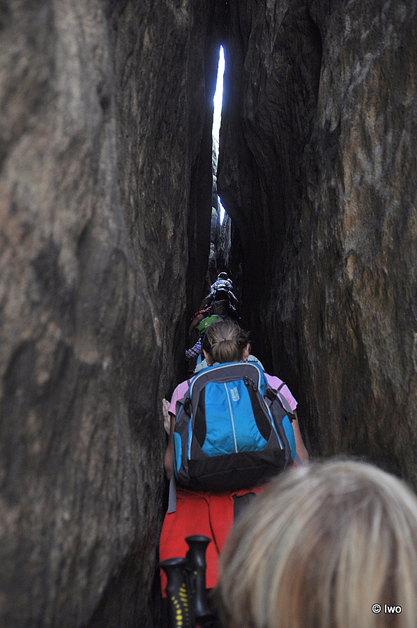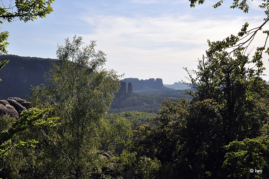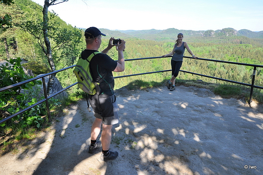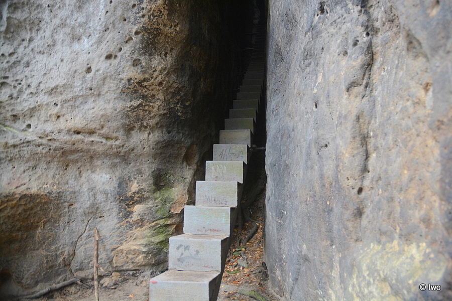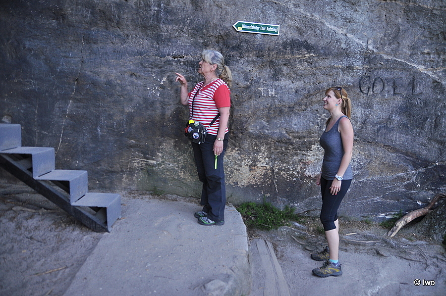 Branou se dá z plošiny, na níž je bouda s hostincem (a bufáčem za rohem), pohodlně projít na vyhlídkovou plošinu. Pokud se vydáte vlevo, narazíte na průrvu, v níž vedou úzké a dost strmé schůdky Himmelsleiter (pozor, jsou jednosměrné). Po nich lze vystoupat na samotnou bránu, kde stával výše zmíněný hrad, z něhož nezbylo nic s výjimkou několika terénních reliktů. Výhledy odtud jsou fantastické, byť aktuálně obdobně jako u nás poněkud deprimující – i tady si vybral svou daň kůrovec a místo do zeleně koukáte do zrzu… Na opačné straně, než je výlez nahoru, jsou širší a spletitější schody, které vedou zpět k hostinci. Tady to chce víc času, pozornosti a mapu do ruky – než se vrátíte k nějakému občerstvování, chce to prozkoumat i okolní skály. Protější stěny bývají obsypány lezci, já tu povětšinou zastihl mládež. Doleva od konce schodů je Schneiderloch. Místo s poněkud dobrodružným a ne úplně snadným přístupem, ale s opět skvělým výhledem…