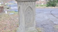 Ve stínu vzrostlého stromu na travnatém cípu před plotem na zarostlé kamenné základně pískovcový sokl s širší spodní částí, zdobenou ze všech stran reliéfními čtyřlístky v rámu. Horní hrana dvojitou profilovanou lištou přechází do užšího těla soklu, které má na všech stranách vpadlé pole ve tvaru goticky lomeného oblouku. Na čelní straně barvou obtažený nápis, dozdobený dekorem: