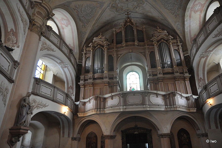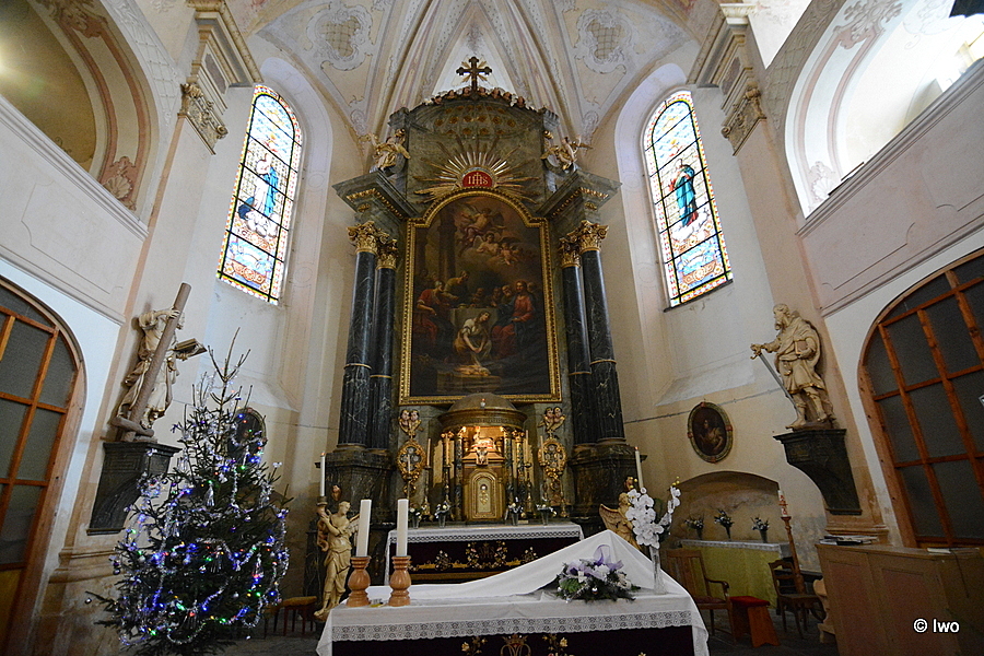 Loď zaklenuta 3 poli valené klenby s lunetovými výsečemi, pole oddělena širokými pasy, které spočívají na zapuštěných sloupech s přisedlými pilastry s hlavicemi zdobenými volutami, mřížkovým dekorem a vysokými úseky římsy. Mezi ně vestavěny dvoupatrové tribuny, segmentově vyklenuté do lodi, sklenuté valeně. Presbytář oddělen triumfálním obloukem neseným dvojicí sdružených pilastrů, sklenutý pásem valené klenby s 2 lunetovými výsečemi a konchou s 3 lunetovými výsečemi. Klenební pasy nasedají na pilastry s vysokým úsekem římsy.