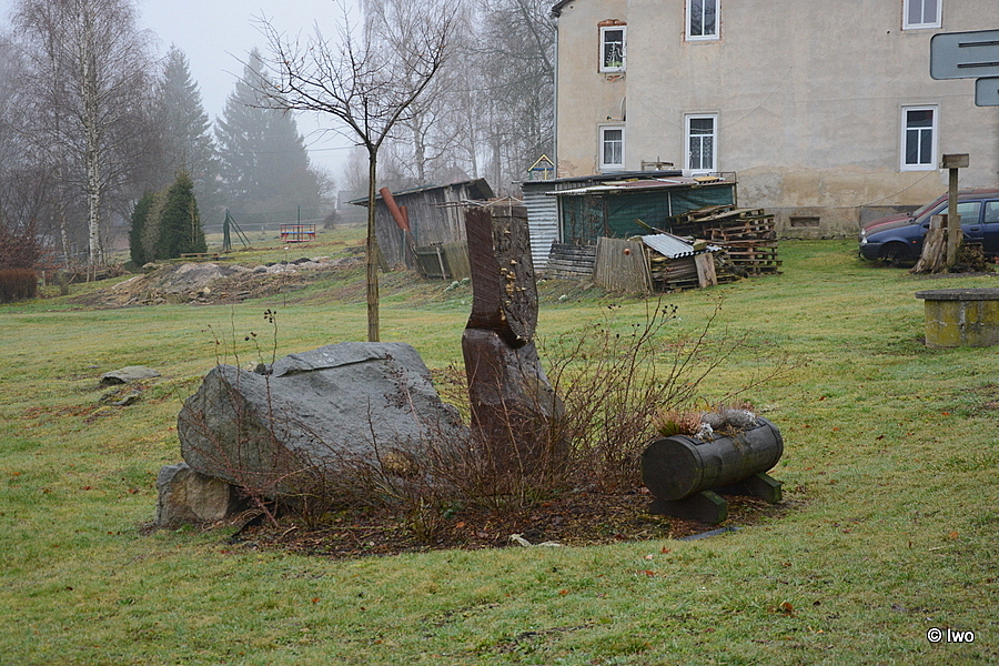 Na travnatém cípu ve středu Lobendavy poblíž dětského hřiště stojí dřevěná plastika s obecním erbem.