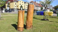V parkově upraveném prostranství mezi ulicemi Kamenná, 1. máje a Krátká v Hrádku nad Nisou dělají společnost zajímavě tvarovaným lavičkám dvě dřevěné sochy.