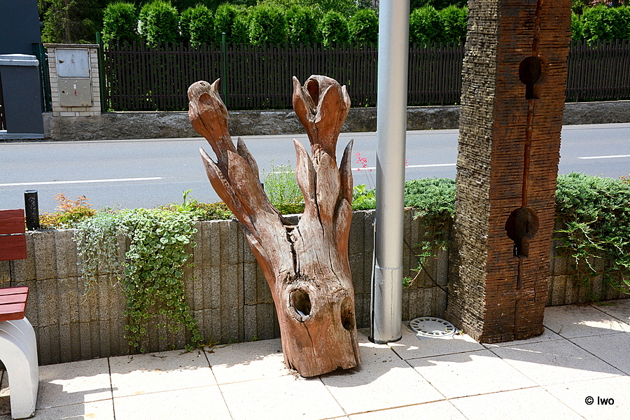 V malé obci Polerady nedaleko Mostu žije sice jen něco přes dvě stovky stálých obyvatel, ale místní jsou velmi aktivní, pořád se tu něco děje a je nač koukat. Třeba na řadu soch, vzniklých při dřevařských sympoziích. Na malém prostranství před místní hospodou stojí dvě sochy. Tedy stojí – vlevo se o betonové květináče opírá skulptura, připomínající jakousi rozkvetlou květinu.