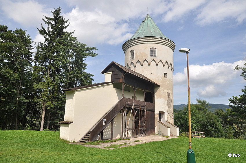 K vidění toho tady vlastně moc není, i když jde o kulturní památku. Velký travnatý plácek s věží, k níž přiléhá zbytek hradeb, nesoucí na vnitřní straně cosi jako pavlač. Na druhé straně silnice podstatně výš další věž, neomítnutá, k níž přiléhá novostavba hrázděného domu z počátku 21. století. Zvláštní stav nejlépe vysvětlí obrázek: