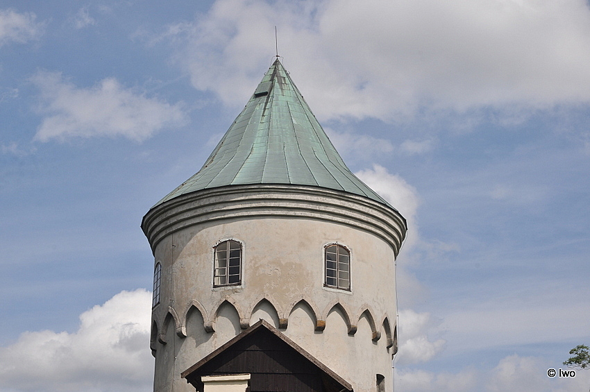 V nárožích hradby stály nejspíše původně 4 před přilehlé kurtiny výrazně vysunuté válcové bateriové věže, z nichž se dochovaly jen dvě. Už v 16. století byly obě nestejně vysoké, jak ukazují soudobá vyobrazení, přičemž menší, jihozápadní věž, sloužící čistě obranným účelům, měla kuželovitou střechu a druhá, vyšší, severovýchodní obytná věž měla složitější zakončení s vyloženým ochozem na krakorcích a prohnutou kuželovitou střechou s lucernou.