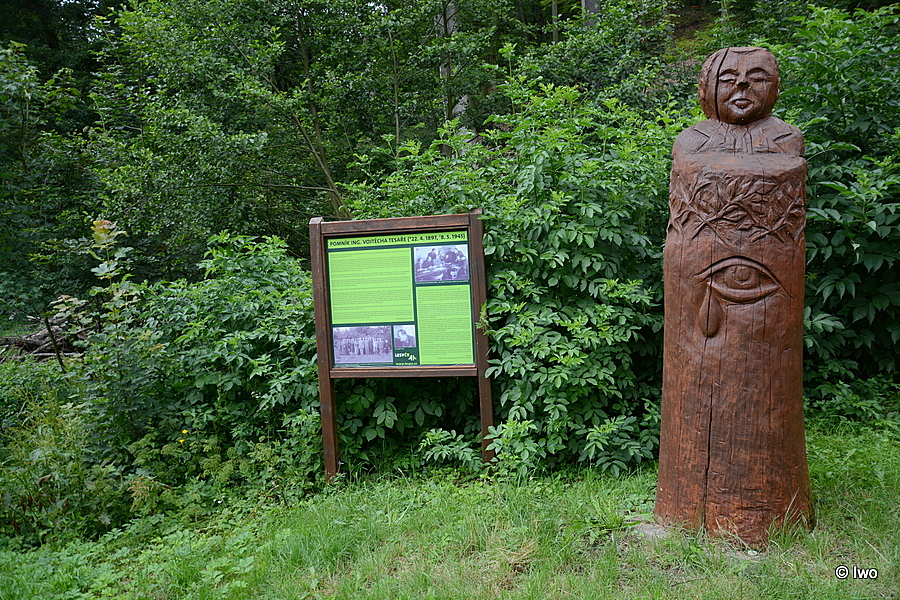 Zcela stejná tabule se shodným textem stojí v Meziboří nedaleko rozcestníku u stadionu, kde ovšem dokáže totálně zmást – začíná totiž slovy „Právě stojíte u pomníku lesního rady Ing. Vojtěcha Tesaře“. Chápu dosaženou úsporu vyrobením dvou totožných kusů, ale když jsem stál v místě, kde krom svahu pokrytého vysokými kopřivami není vůbec nic, zapochyboval jsem, zda opravdu vidím dobře. Vysvětlilo se to až po pár kilometrech zde, kde opravdu pomník stojí…