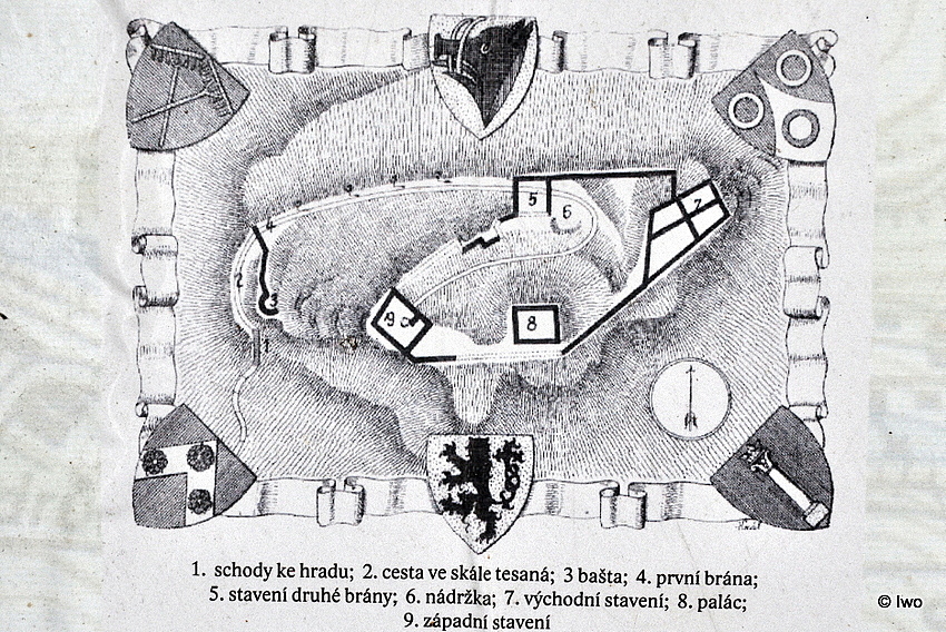 Hrad dvojdílné dispozice půdorysu tvaru nepravidelného protáhlého oválu na vrcholu osamoceného znělcového ostrohu, který se svou nadmořskou výškou 717 m n. m. vypíná zhruba 50 metrů nad okolním terénem.
