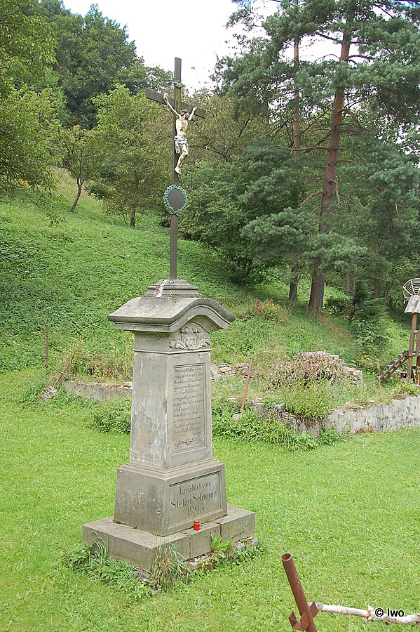 Na úpatí travnatého svahu vysoký několikastupňový sokl. Přímo v trávě nízká kamenná základna obdélného půdorysu, na ní vyšší stupeň z několika bloků. Samotný sokl je dvouetážový, zužující se směrem vzhůru. Spodní díl přecházející do vlastního těla dvojitou oblou lištou má na čelní straně vpadlé lichoběžníkové zrcadlo s nápisem: „Errichtet von / Stefan Schwanz / 1903“. Stejné příjmení se vyskytuje na pomníku obětí Velké války, ale konkrétně o Stefanovi nelze najít nic.