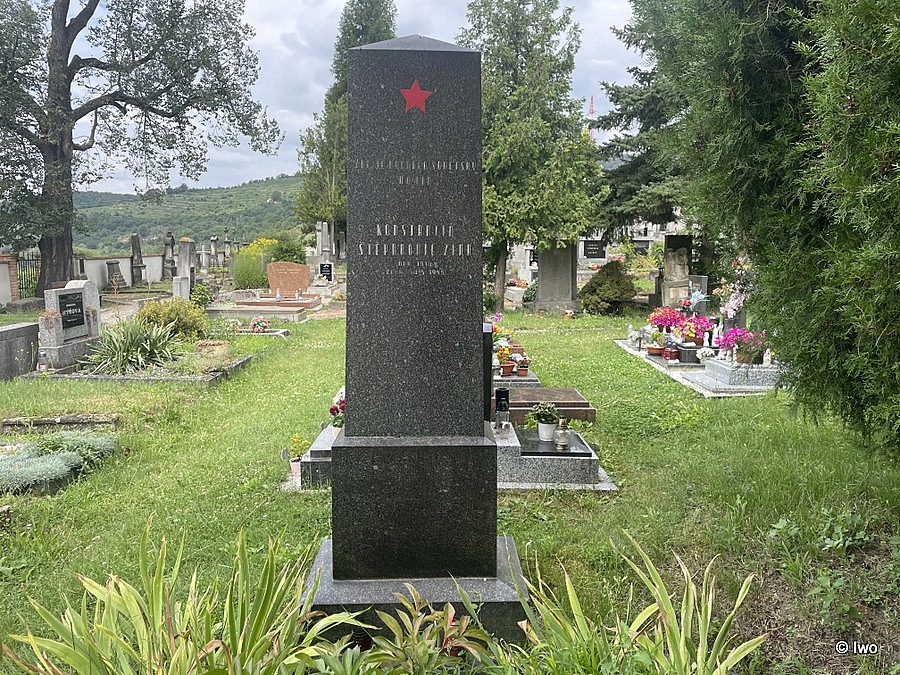 Hrob č. 80 na hřbitově, z černé žuly, ozdoben rudou hvězdou a nápisem, obklopen květy. Ruský zajatec.
