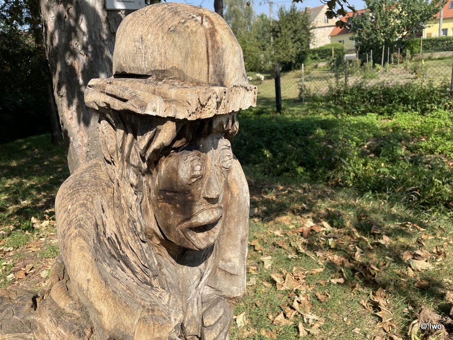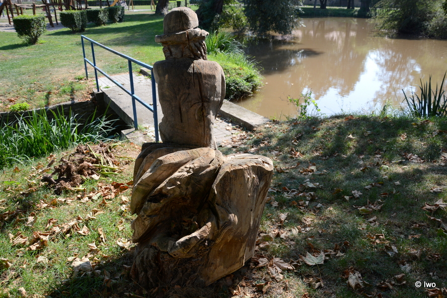 Sochy už asi nejsou nejmladší, dřevo v exteriéru dost utrpělo, vodníkovi chybí část klobouku.