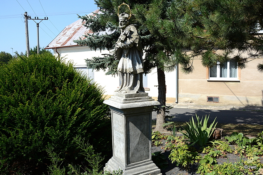 Na kamenném soklu se silnější římsou figura světce v obvyklém pojetí: stojí v kontrapostu, má kanovnické roucho, na hlavě biret, okolo hlavy na kovové obruči svatozář hvězd, křížek v levé ruce, palmovou ratolest v pravé. Nedatovaná, asi z pol. 18. stol..