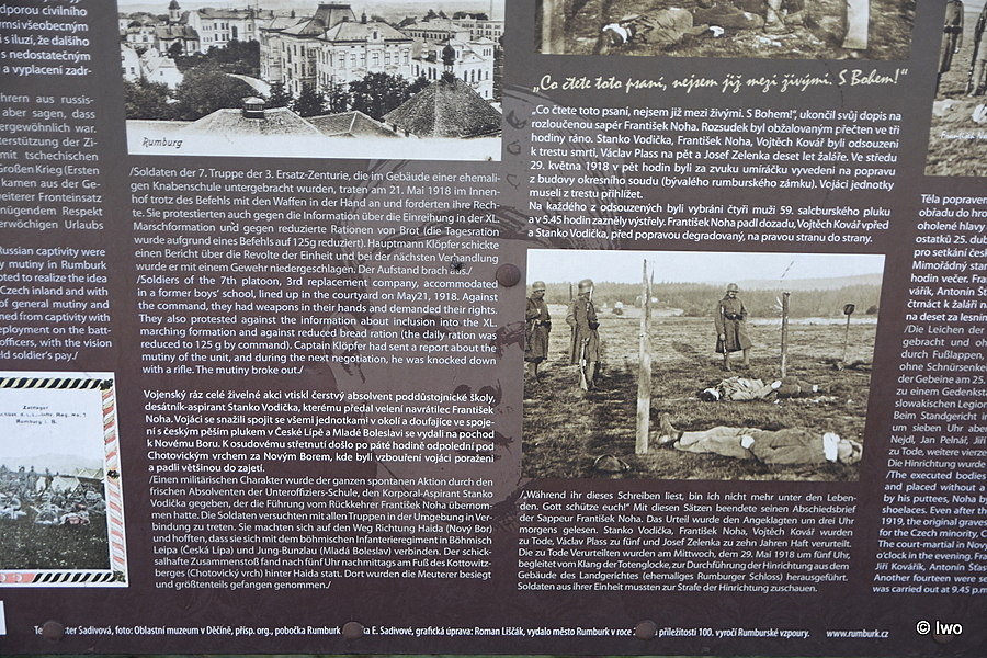 Text: „ZA CHLÉB, MÍR / SVOBODU / 29.5.1918 BYLI ZDE POPRAVENI / ORG. RUMBURSKÉ VZPOURY 7.STŘEL. PL./ Z PLZNĚ /