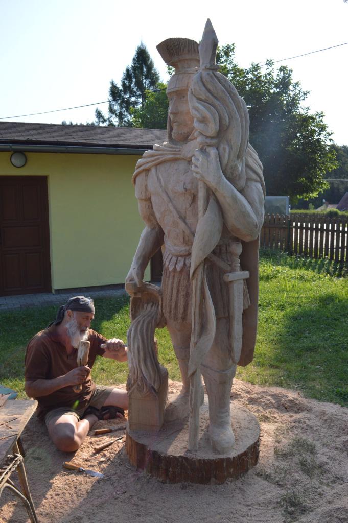 Před hasičskou stanicí v ulici Požárníků v Dubé stojí dřevěná socha svatého Floriána.