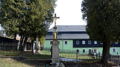 Krom velkého kovového kříže, který je připomínkou 18. února 1975 zbořeného kostele svatého Martina v Brtníkách, stojí na místě bývalé stavby…