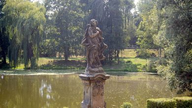 Na břehu slepého ramene Ohře pod zámkem v Libochovicích u cesty na Kerkově nábřeží stojí řada soch – třetí zleva…